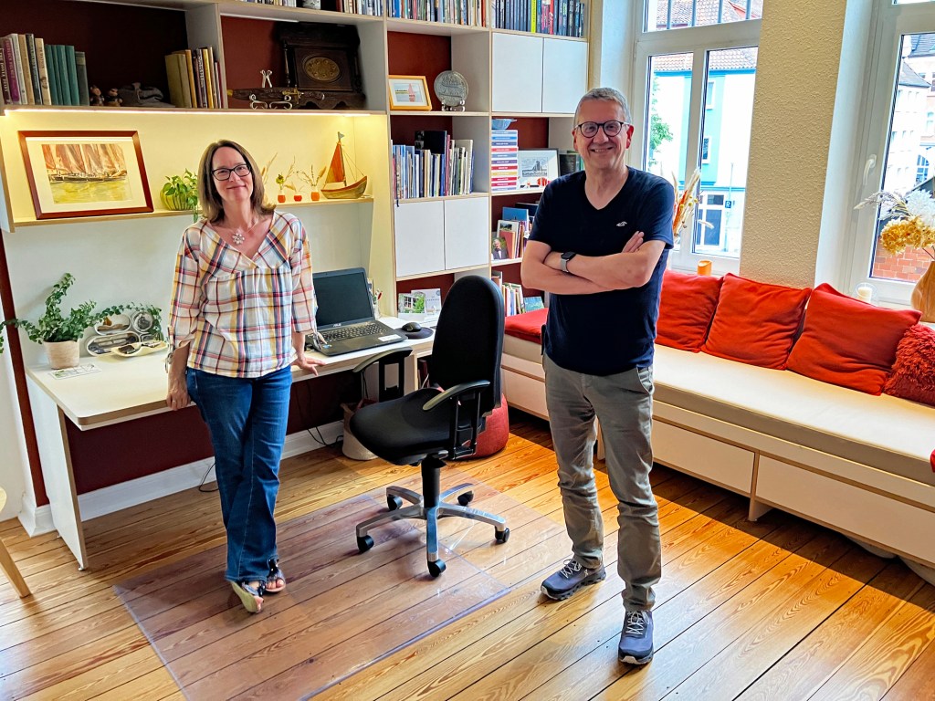 Die Schriftstellerin Corinna Kastner haben wir am 27. Juli 2024 in Hameln besucht. Nach einer schönen Kaffeetafel auf dem Balkon sind die Fotografien sämtlichst auf der Straße vor dem Wohnhaus entstanden. Das Foto zeigt Corinna Kastner in ihrem Arbeitszimmer, neben ihr Jürgen Rasch. (zum Eintrag)
